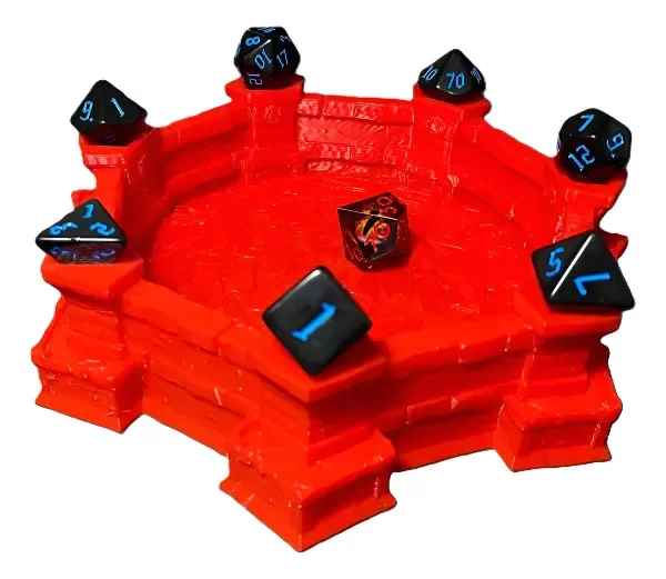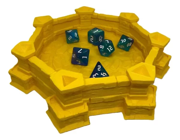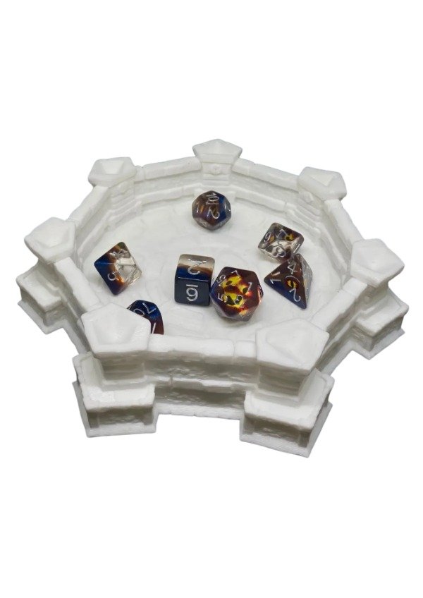 Esta bandeja tipo Castillo cuenta con 7 torres individuales para alojar el clásico set de 7 dados poliédricos, manteniéndolos ordenados y siempre listos para la próxima aventura.