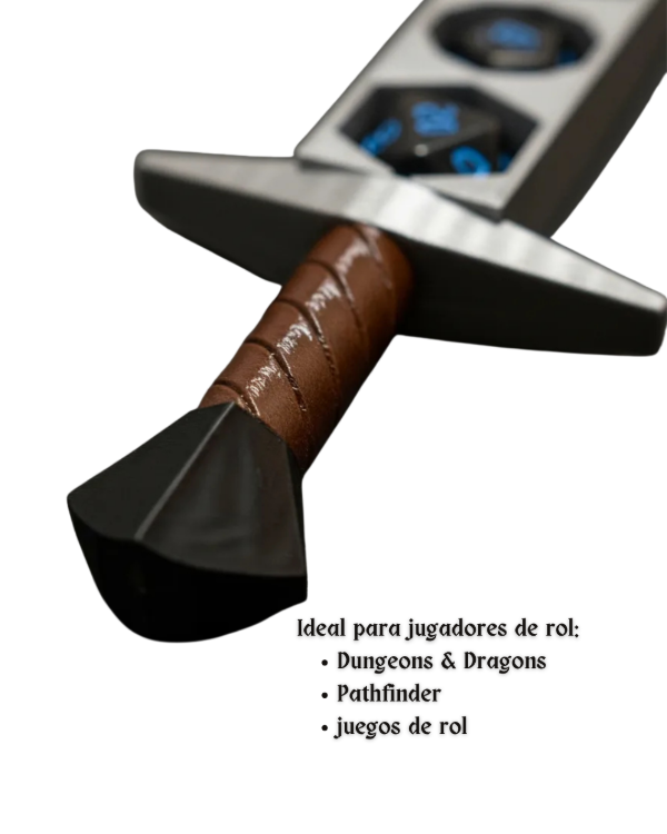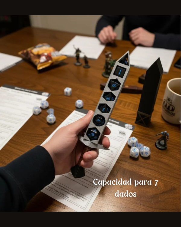 Esta Espada Porta Dados está diseñada con 7 espacios individuales para alojar el clásico set de 7 dados poliédricos de rol. Un accesorio original que combina organización, protección y estilo épico en tu mesa de juego.