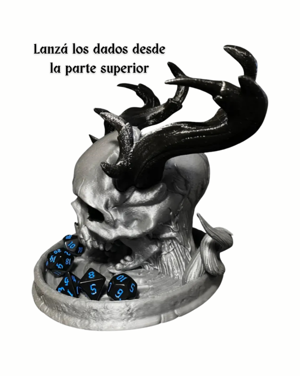 La abertura en la parte superior del cráneo permite lanzar los dados fácilmente. Estos descienden por el interior de la estructura hasta salir por la boca o la base, garantizando un lanzamiento mezclado y completamente aleatorio.